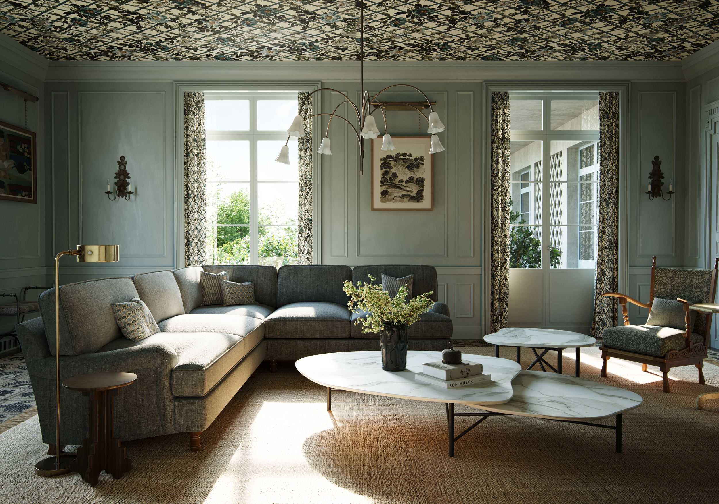 Originally sitting uninspired above the room’s intricate wall moulding, we brought House of Hackney’s Bryher Rose print to the central ceiling inset at the family room. Matching drapery panels offered a fun opportunity to dress the whole space with the bold floral.
